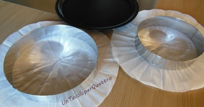 Su uno dei due fogli di carta da forno stendere metà della pasta allo spessore di circa 1 cm. Tagliarla con l'anello più grande e rimuovere all'esterno la parte in eccesso. Tagliare il disco di pasta con l'anello più piccolo in modo da ottenere un disco forato, che andremo ad utilizzare come bordo.