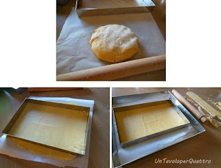 Togliere il panetto di frolla dal frigo e stendere con il mattarello direttamente su un foglio di carta da forno. Ritagliare la base con lo stampo e rivestire con la frolla anche i bordi all'interno.